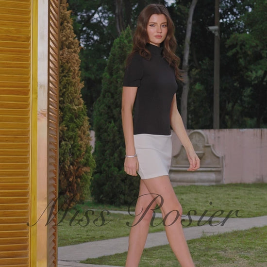 Upgrade your wardrobe with this chic Black & White Color-Block Mini Dress, sophisticated look. With its sleek turtleneck, short sleeves, and fitted silhouette, this dress flatters your shape while keeping the style effortlessly minimal.